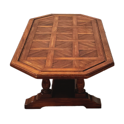 Design: Elongated octagonal top with parquet wood inlay and a traditional trestle frame