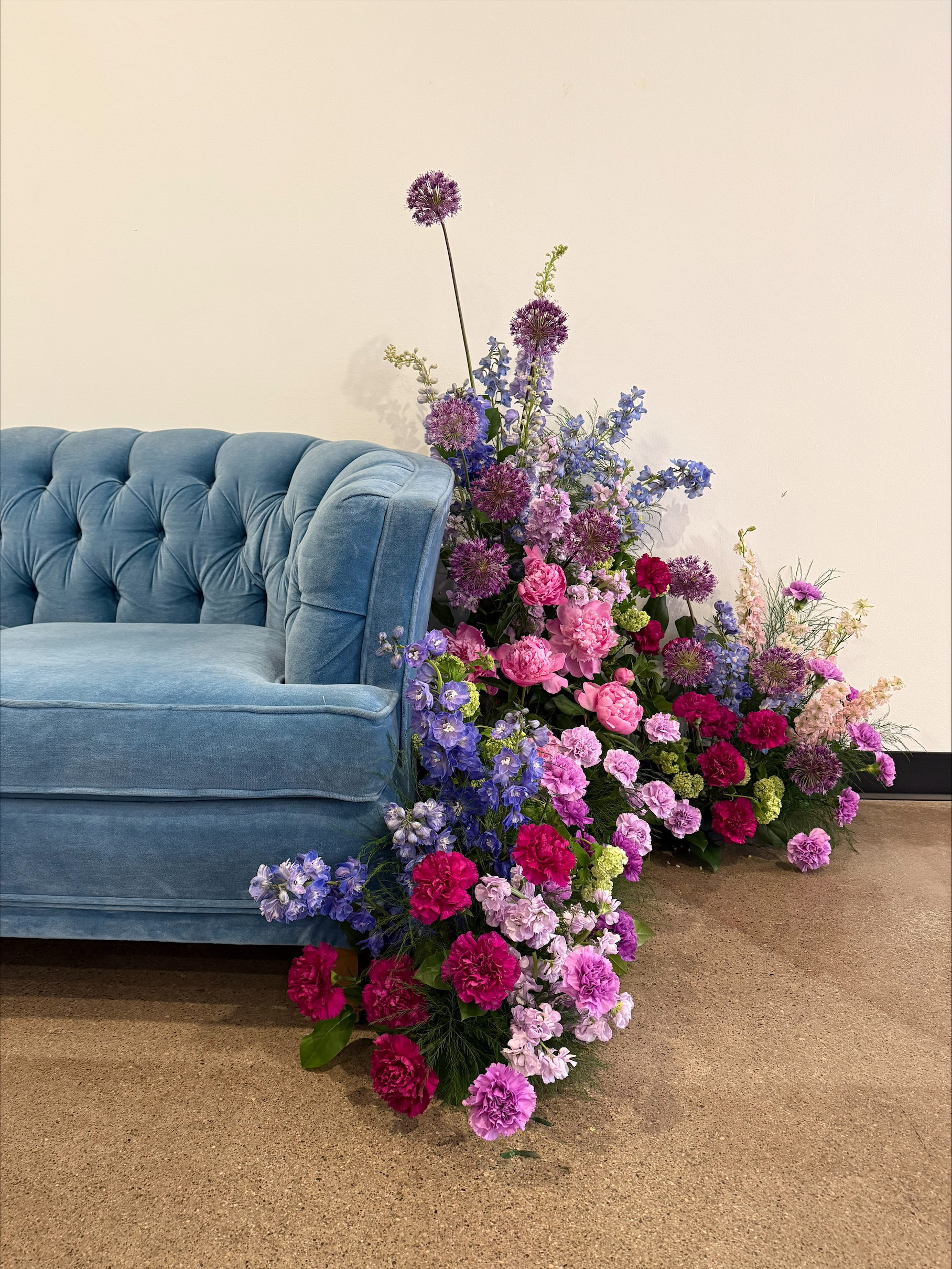 Precious bright blue vintage settee. Tufted true blue velvet. Two-seat cushions. Seats 2. Sits low to the ground, so this settee is best utilized for guest-of-honor seating or a photo opportunity. Add to Wishlist for a quote!