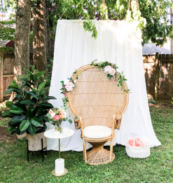 Ready to add a touch of dramatic flair and comfortable elegance to your event’s seating? Our rentable Peacock Chair from Violet Vintage in Indianapolis is here to make a statement! This iconic chair features a high, fan-shaped back, often made of woven material, creating a truly eye-catching silhouette. It’s perfect for adding a touch of bohemian glamour and comfortable seating to weddings, parties, lounges, photo booths, or any gathering that deserves a touch of the extraordinary.