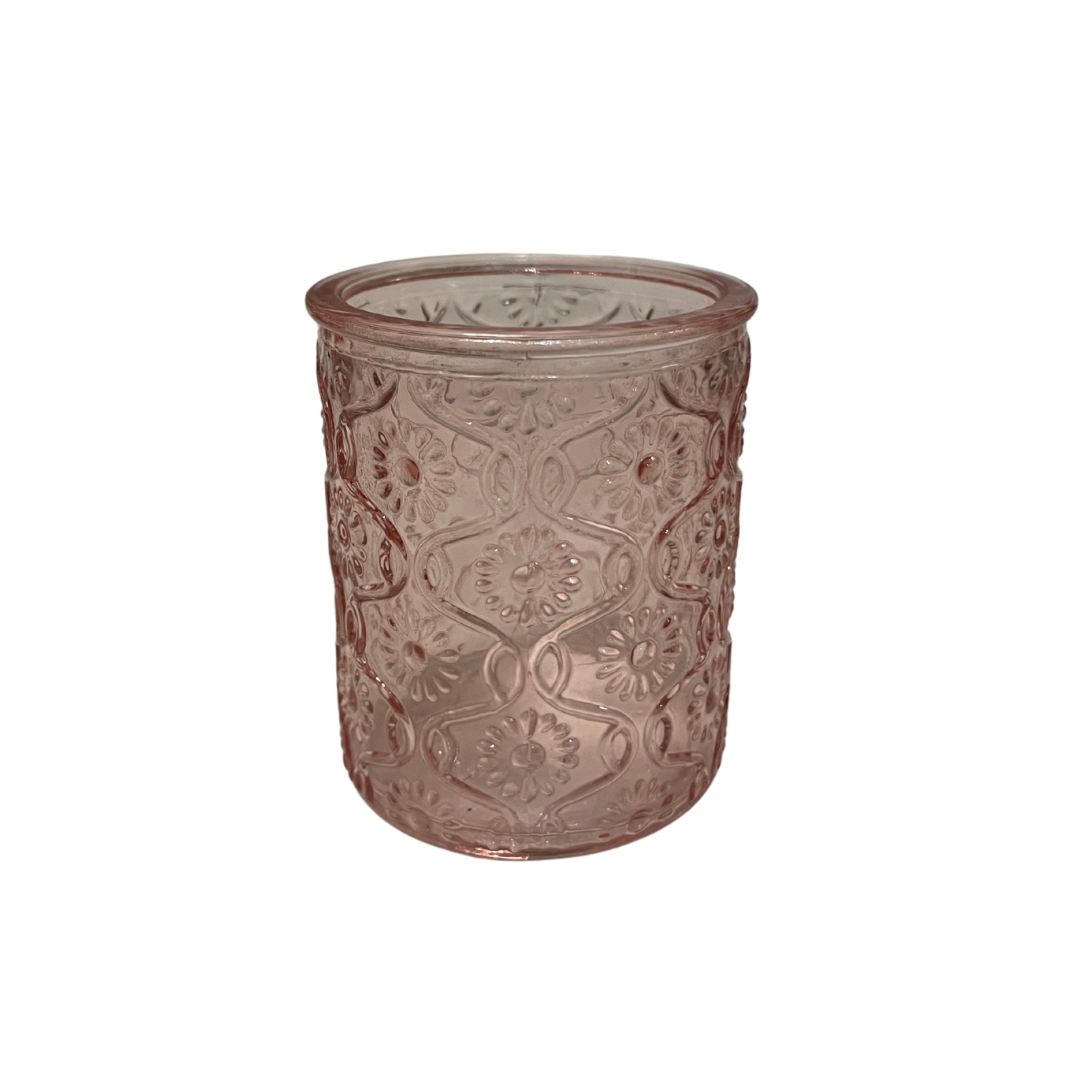 Pink embossed glass votives. Add to Wishlist for a quote!