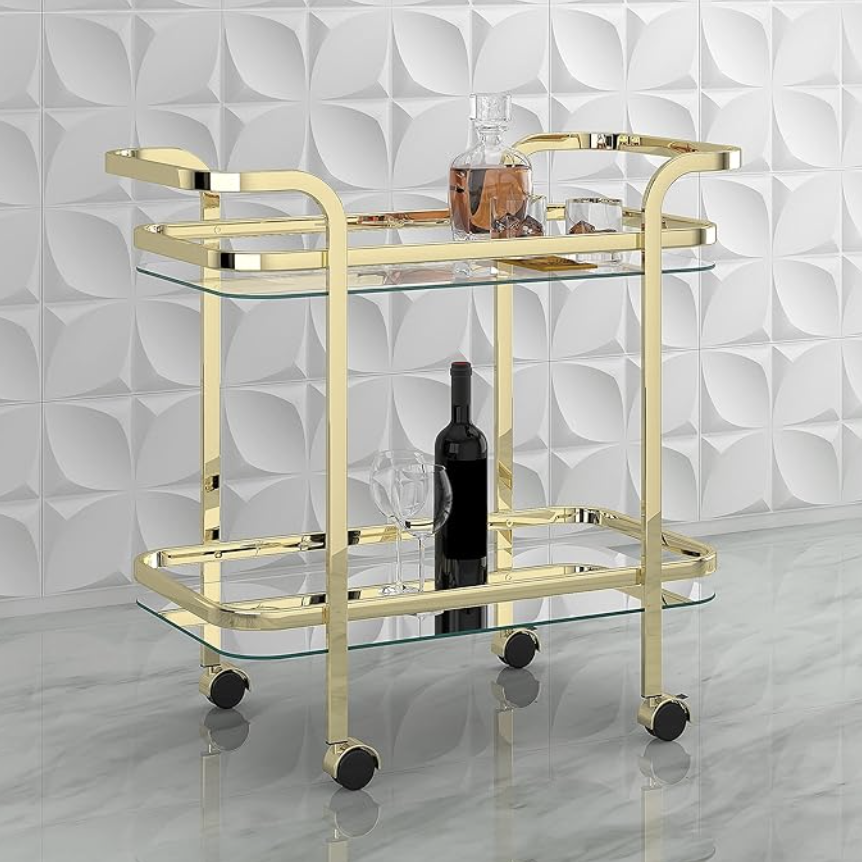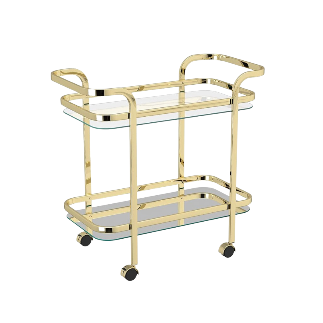 Modern bar cart with glass shelving and a shiny brass frame. Add to Wishlist for a quote!